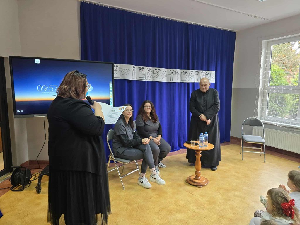 Uczniowie klasy piątej wraz ze swoją Wychowawczynią, Panią Agatą Mindą, zorganizowali “ZwierzoTydzień”. W akcję włączyli się również Rodzice uczniów klasy 5. Był to wyjątkowy czas, w którym główną rolę grały zwierzęta. Były filmy fabularne, były spotkania z ekspertami, były konkursy fotograficzne i filmowe, był kiermasz słodkości na rzecz schroniska i wiele innych aktywności.