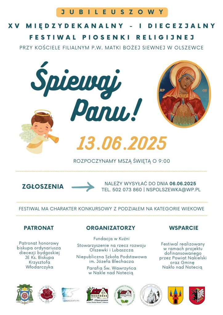 Zapraszamy do udziału w XV Międzydekanalnym – I Diecezjalnym Festiwalu Piosenki Religijnej “Śpiewaj Panu”, który odbędzie się 13 czerwca 2025 roku przy kościele filialnym w Olszewce. Jubileuszowy Festiwal objął swym patronatem Jego Ekscelencja Ks. Biskup Krzysztof Włodarczyk. Więcej informacji w zakładce FESTIWALE.