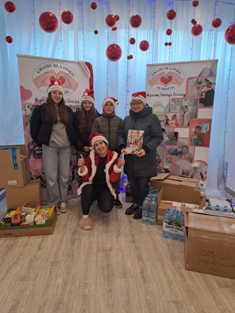 Uczniowie klasy siódmej 6 grudnia, zawieźli dary zebrane w naszej szkole do Fundacji “Gramy dla Onko”, która mieści się w Bydgoszczy. To już druga akcja uczniów tej klasy, w ubiegłym roku po raz pierwszy zbierali dary dla dzieci chorujących na nowotwory. Cieszymy się, że i w tym roku otworzyły się serca ofiarodawców, dzięki którym zawieźliśmy wiele kartonów z różnymi darami.