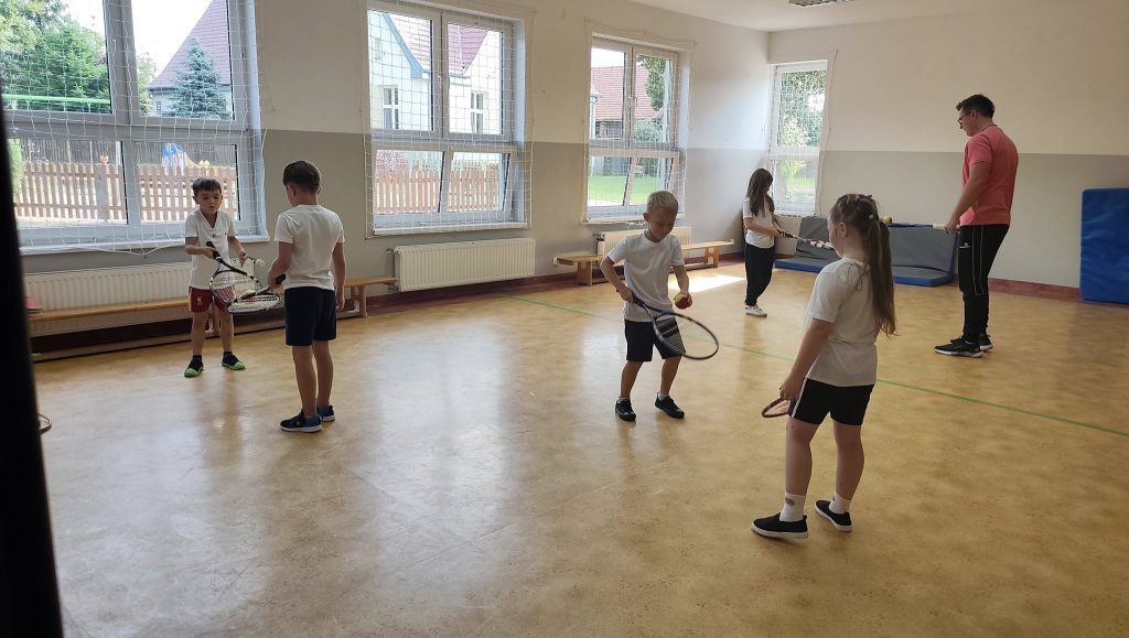 W naszej szkole ruszyły zajęcia tenisowe dla najmłodszych uczniów – klas 1–3 oraz dzieci z oddziału przedszkolnego. To doskonała okazja, by poprzez zabawę i ruch rozwijać sprawność fizyczną, koordynację oraz pasję do sportu. W tym roku zajęcia prowadzić będzie Pan Filip – doświadczony instruktor, który z ogromnym zaangażowaniem i uśmiechem wprowadza dzieci w fascynujący świat tenisa. Pod jego okiem uczestnicy poznają podstawowe zasady gry, uczą się prawidłowego chwytu rakiety, techniki odbić oraz pracy nóg. Wszystko odbywa się w atmosferze zabawy i radości, dostosowanej do wieku i możliwości najmłodszych sportowców.