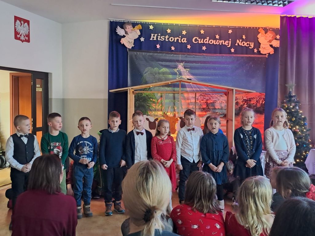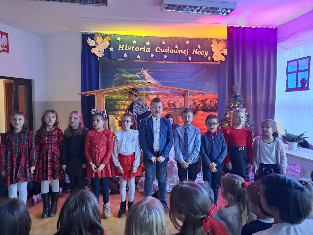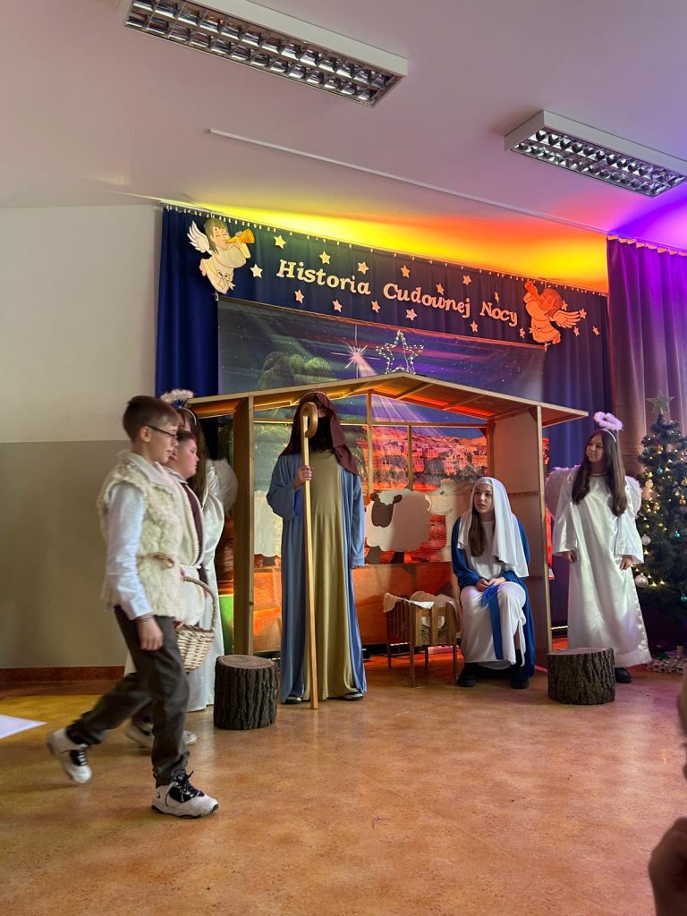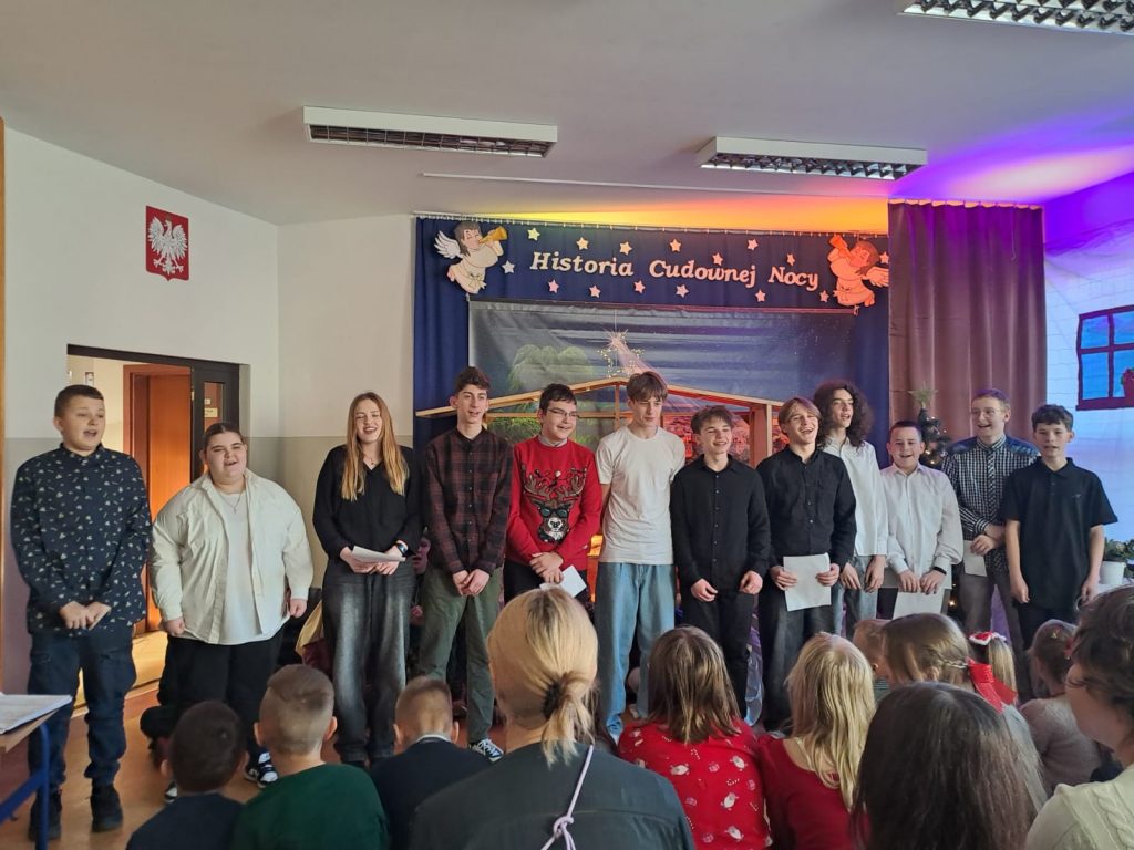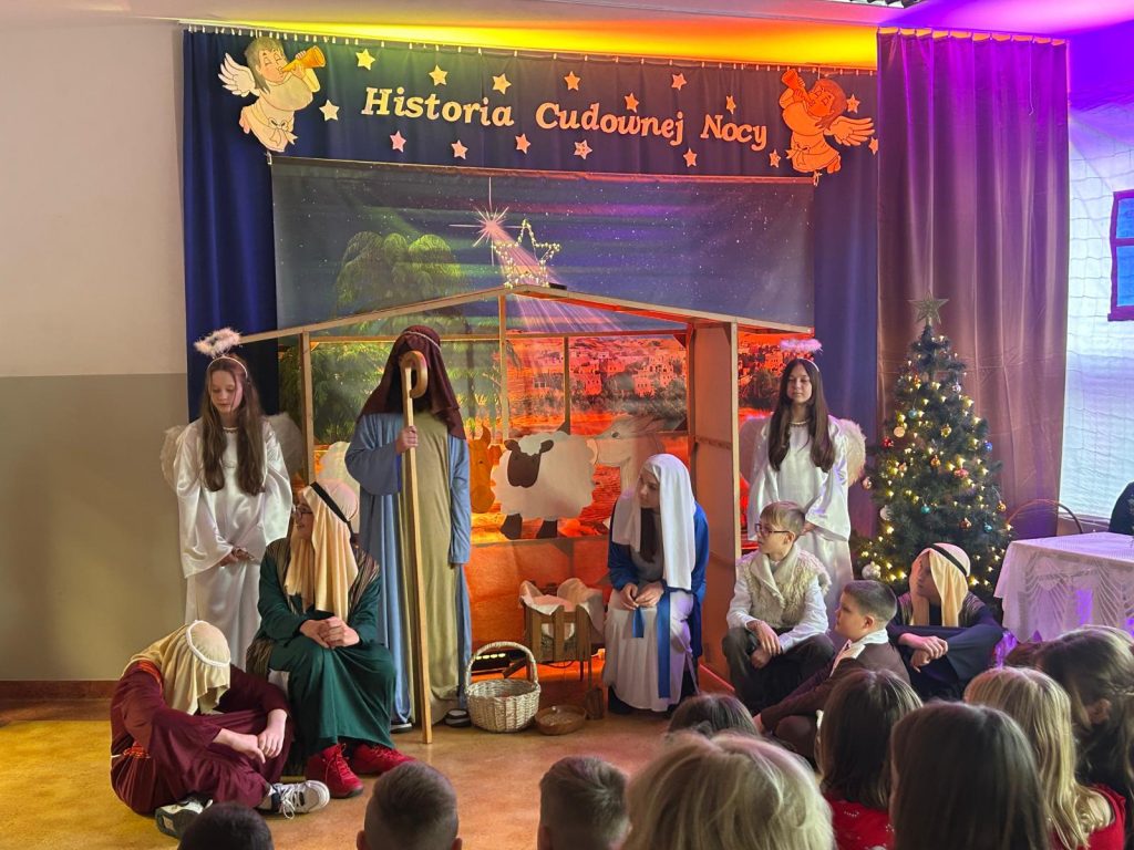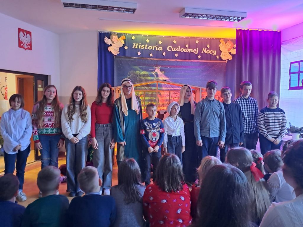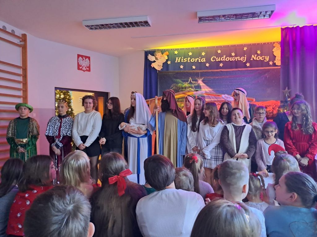 W piątek, 20 grudnia był ostatnim dniem nauki przed świąteczną przerwą związaną z Bożym Narodzeniem. Od samego rana w klasach uczniowie wraz z wychowawcami zasiedli do klasowej wigilii. Nauczyciele zatroszczyli się o to, by wigilia przebiegła zgodnie z naszą polską tradycją. W klasach rozbrzmiewały kolędy śpiewane przez uczniów. Po wigilii wszyscy spotkali się na sali gimnastycznej, aby obejrzeć jasełka w wykonaniu uczniów klasy siódmej i kilku z klasy szóstej i piątej. Młodzi aktorzy w piękny sposób przybliżyli historię cudownej nocy, gdy narodził się Pan Jezus. Po jasełkach odbyło się wspólne kolędowanie, podczas którego każda klasa wykonała jedną kolędę lub pastorałkę. Swój występ mieli również nauczyciele i pracownicy naszej szkoły, którym akompaniował Radek Peter na ksylofonie – uczeń klasy VI. W tak cudownym, radosnym nastroju wszyscy udali się do domów.