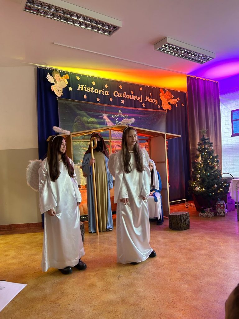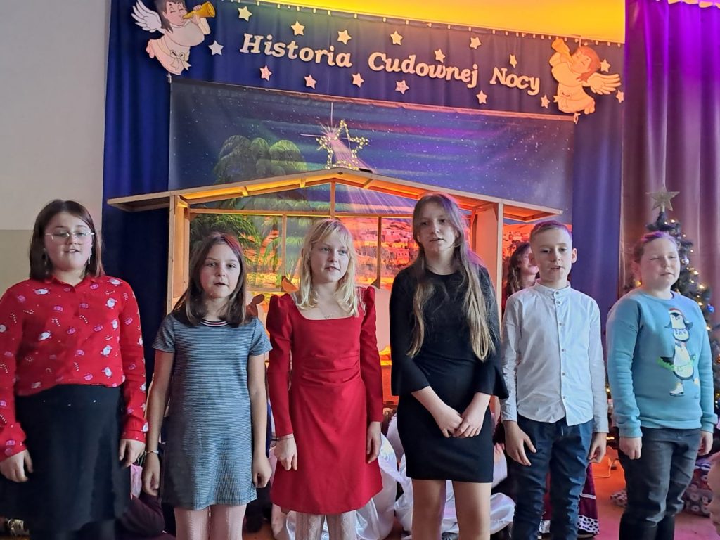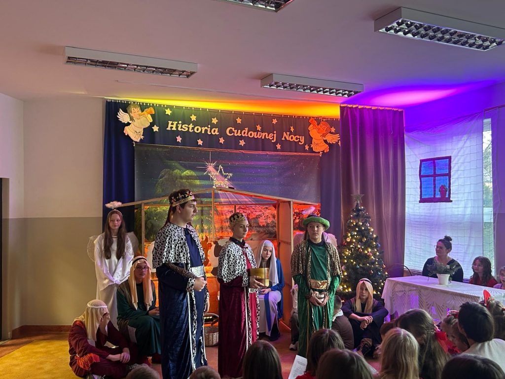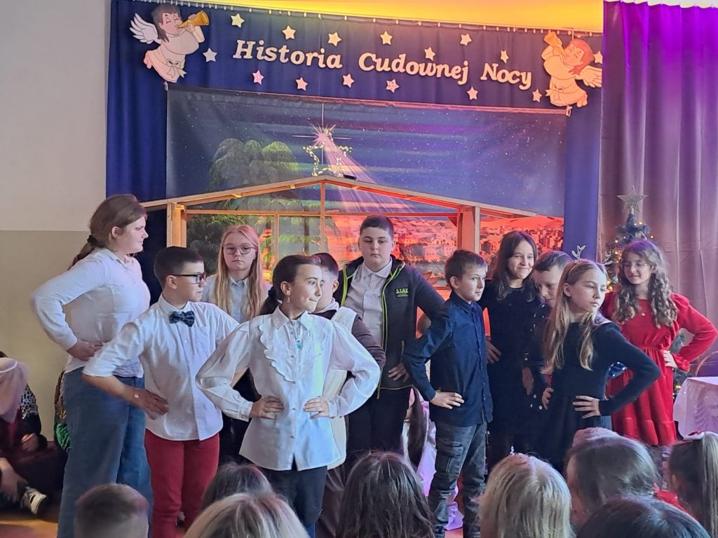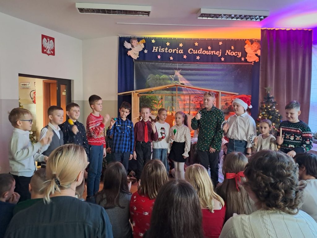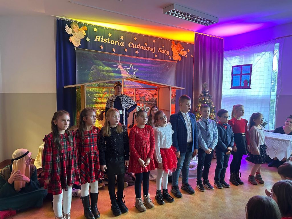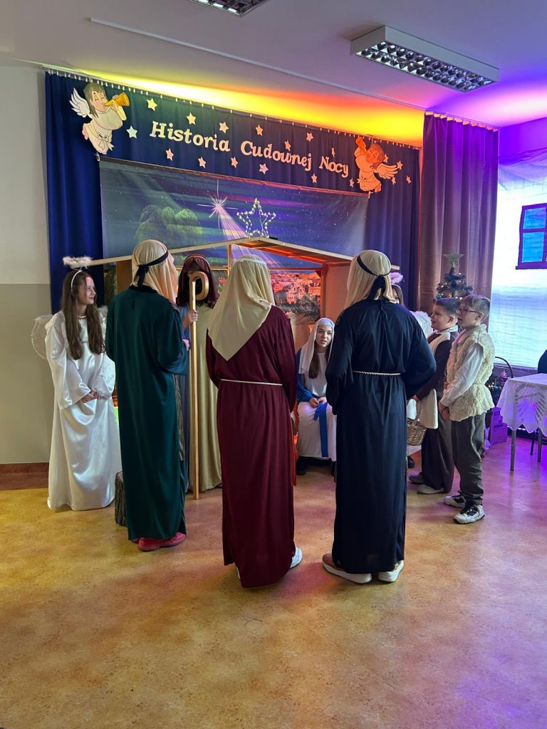 W piątek, 20 grudnia był ostatnim dniem nauki przed świąteczną przerwą związaną z Bożym Narodzeniem. Od samego rana w klasach uczniowie wraz z wychowawcami zasiedli do klasowej wigilii. Nauczyciele zatroszczyli się o to, by wigilia przebiegła zgodnie z naszą polską tradycją. W klasach rozbrzmiewały kolędy śpiewane przez uczniów. Po wigilii wszyscy spotkali się na sali gimnastycznej, aby obejrzeć jasełka w wykonaniu uczniów klasy siódmej i kilku z klasy szóstej i piątej. Młodzi aktorzy w piękny sposób przybliżyli historię cudownej nocy, gdy narodził się Pan Jezus. Po jasełkach odbyło się wspólne kolędowanie, podczas którego każda klasa wykonała jedną kolędę lub pastorałkę. Swój występ mieli również nauczyciele i pracownicy naszej szkoły, którym akompaniował Radek Peter na ksylofonie – uczeń klasy VI. W tak cudownym, radosnym nastroju wszyscy udali się do domów.