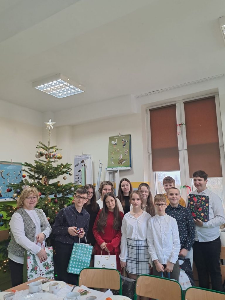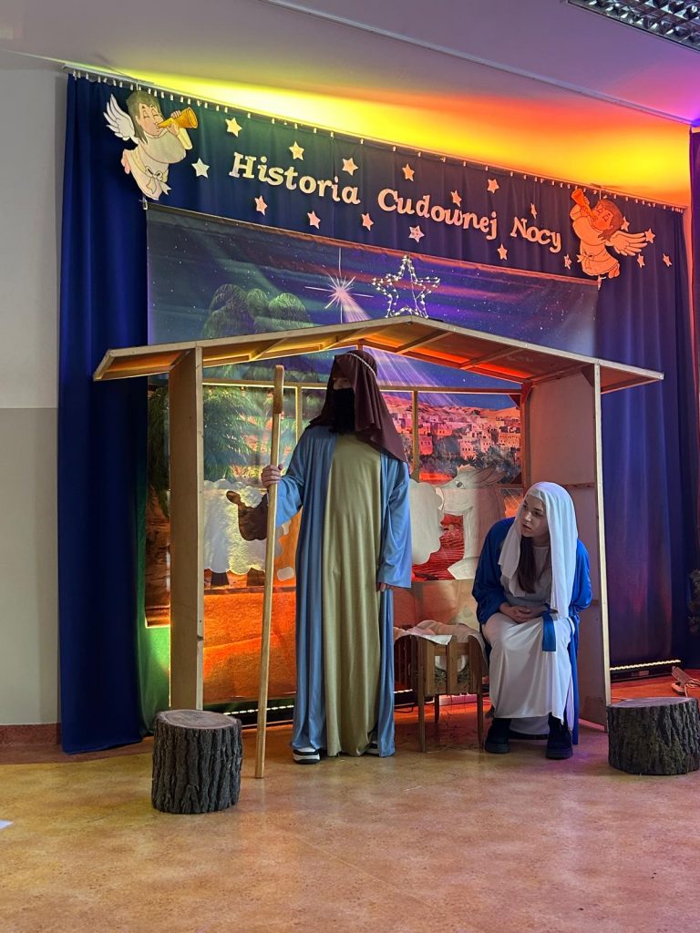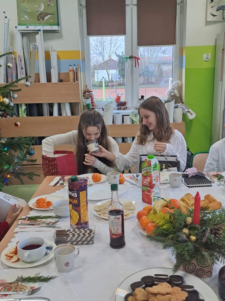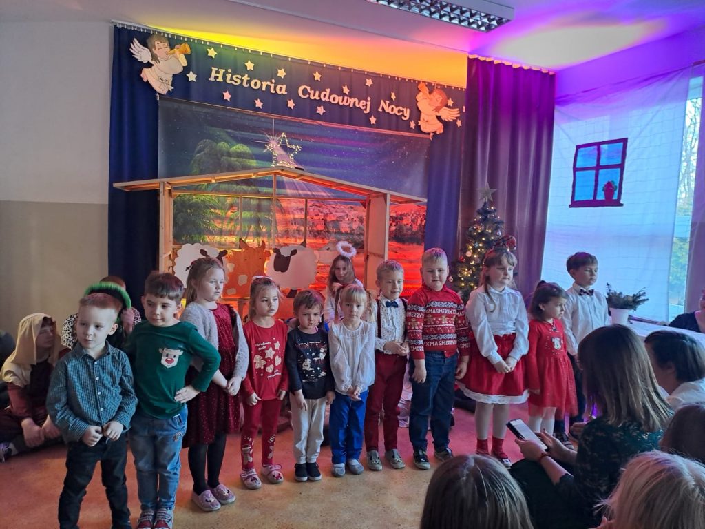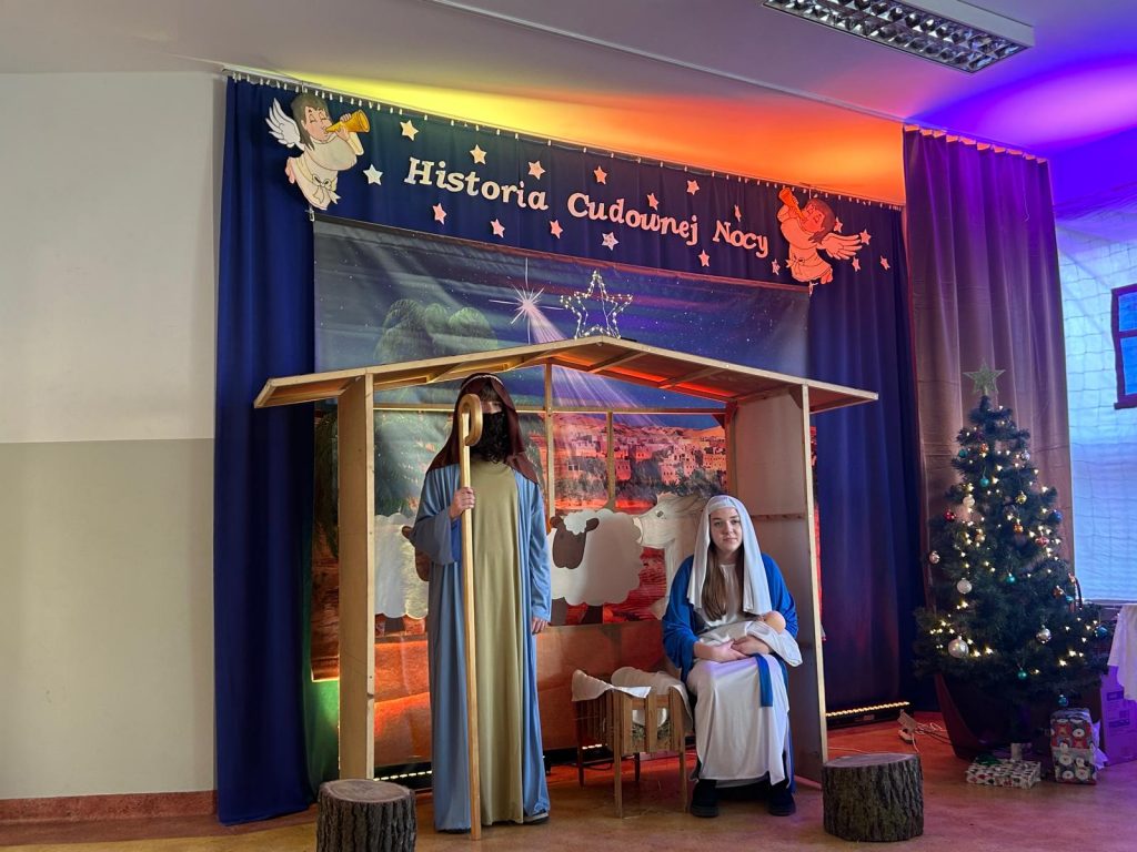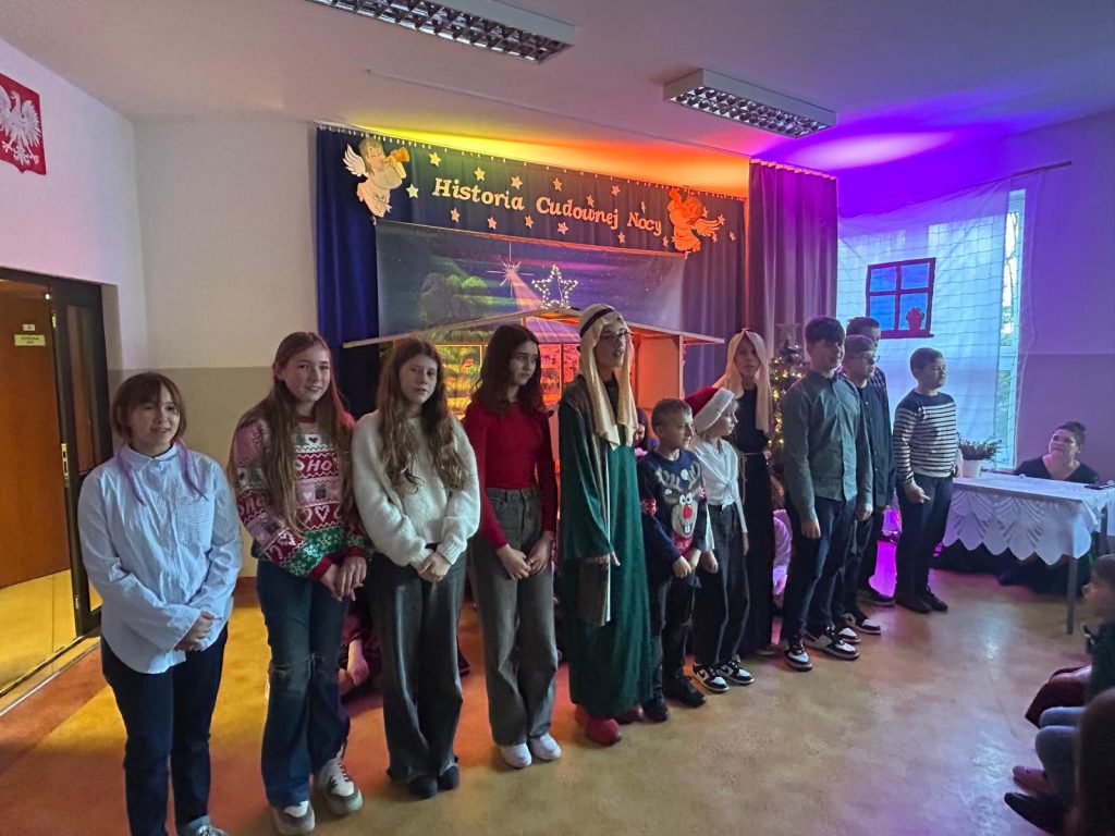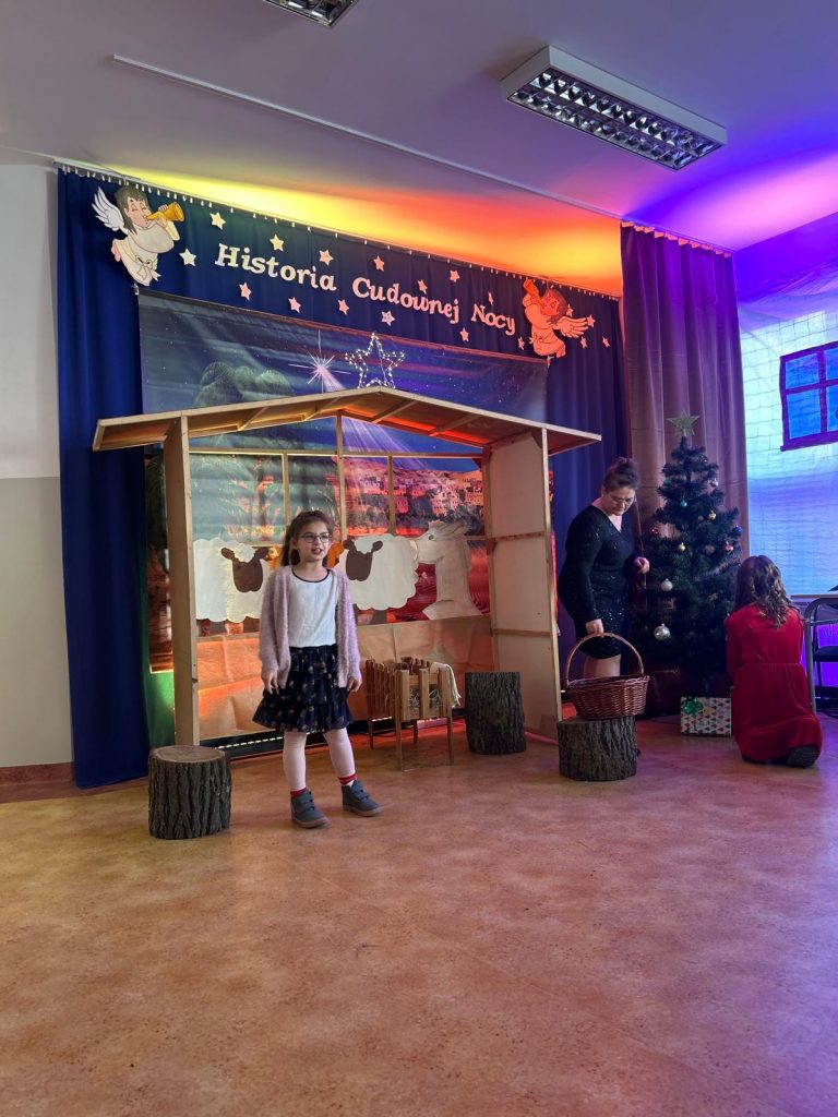 W piątek, 20 grudnia był ostatnim dniem nauki przed świąteczną przerwą związaną z Bożym Narodzeniem. Od samego rana w klasach uczniowie wraz z wychowawcami zasiedli do klasowej wigilii. Nauczyciele zatroszczyli się o to, by wigilia przebiegła zgodnie z naszą polską tradycją. W klasach rozbrzmiewały kolędy śpiewane przez uczniów. Po wigilii wszyscy spotkali się na sali gimnastycznej, aby obejrzeć jasełka w wykonaniu uczniów klasy siódmej i kilku z klasy szóstej i piątej. Młodzi aktorzy w piękny sposób przybliżyli historię cudownej nocy, gdy narodził się Pan Jezus. Po jasełkach odbyło się wspólne kolędowanie, podczas którego każda klasa wykonała jedną kolędę lub pastorałkę. Swój występ mieli również nauczyciele i pracownicy naszej szkoły, którym akompaniował Radek Peter na ksylofonie – uczeń klasy VI. W tak cudownym, radosnym nastroju wszyscy udali się do domów.